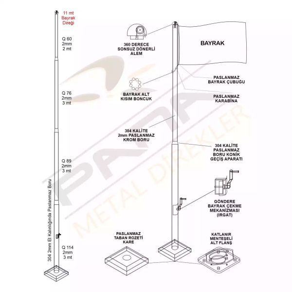 11 metre standart bayrak direği ürünümüzde 360°Sonsuz Döner Tepe, Bayrak Boncuğu, İp Sarma Mekanizması(Irgat,Patentli Ürün), Taban Rozeti(Kare), Menteşeli Flanş ve Ankaraj Malzemeleri bulunmaktadır. Bayrak ürüne dahil değildir.