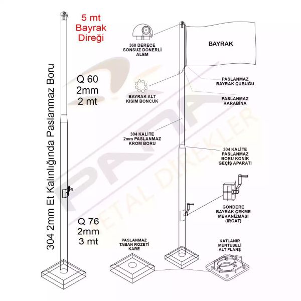 5 metre standart bayrak direği ürünümüzde 360°Sonsuz Döner Tepe, Bayrak Boncuğu, İp Sarma Mekanizması(Irgat,Patentli Ürün), Taban Rozeti(Kare), Menteşeli Flanş ve Ankaraj Malzemeleri bulunmaktadır. Bayrak ürüne dahil değildir.