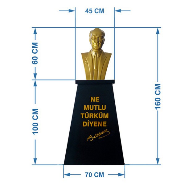 Atatürk Büstü kaidesi olarak imal ettiğimiz bu modelin çift taraflı paslanmaz galvaniz sac üzerine elektrostatik fırın boya yapılmıştır . Alt kısmında yere montajıda yapılabilen hazır kaide modelinin, üzerindeki yazı gold renginde folyo harf den istenilen metin yazılacaktır. Üst kısımdaki Atatürk Büstü 60 cm yüksekliğinde profesyonel modeldir.