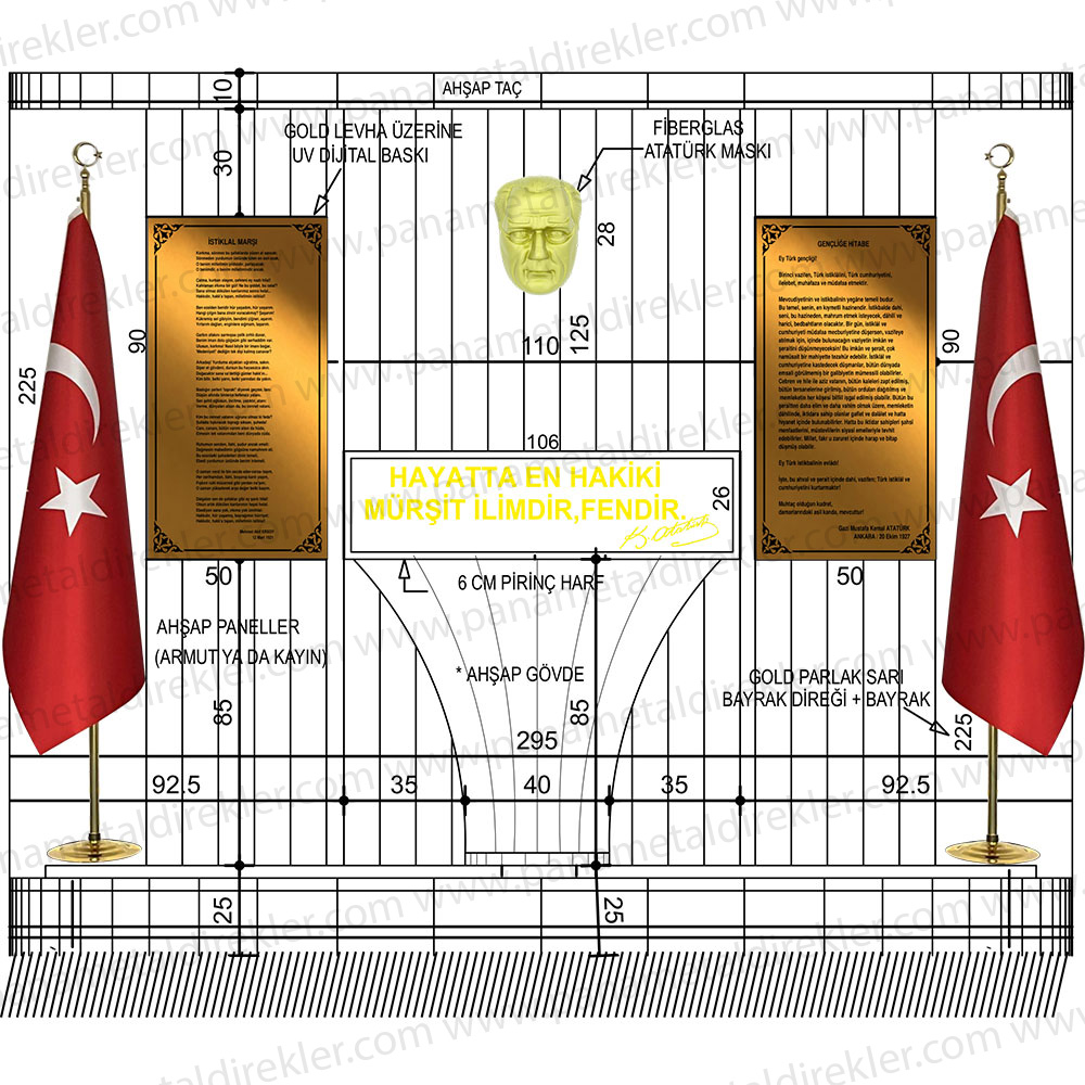 İstenilen özelliklere sahip Atatürk köşesi ürünleri, okullar, kamu kurumları, belediyeler, özel kuruluşlar ve ofislerde Atatürk’ü ve onun ilke ve inkılaplarını yaşatmak amacıyla kullanılmaktadır. İstiklal Marşı ve Gençliğe Hitabe levhaları, Atatürk’ün vizyonunu yansıtan vecizeleri ve maskı ile tamamlanan bu köşe, hem estetik hem de anlam derinliği taşıyan bir alan sunar. Paslanmaz gold levha üzerine UV baskı teknolojisi ile üretilen bu ürünler, uzun ömürlü ve dayanıklıdır. Bayrak direği ve bayrak setiyle birlikte tam bir takım olarak, özenle paketlenmiş bir şekilde sevk edilir.